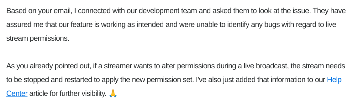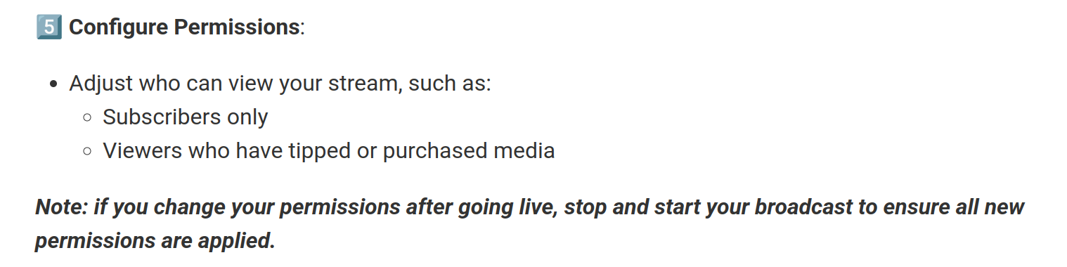 I reported the issue to Fansly January 27, 2025 and on January 29, 2025 I was told their development team was contacted and said the “feature is working as intended and were unable to identify any bugs with regard to live stream permissions,” but at least their help section for livestreaming got updated to warn creators to restart streams to properly apply new access permissions (I do not have a picture of the before).